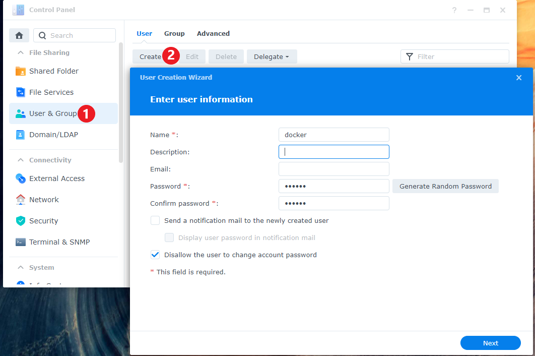 In the User section, create a new user. Name it whatever you like, but for this guide, we will use the name docker.